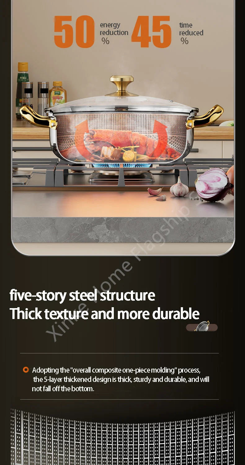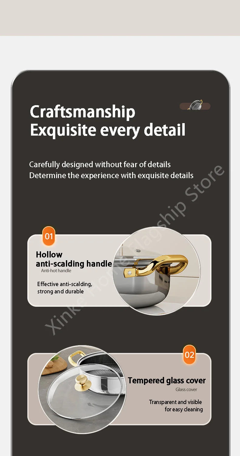 2. Visual tempered glass pot lid, no rivet cleaning in the pot is more convenient, double-sided honeycomb concentrated energy cyclone pot bottom.