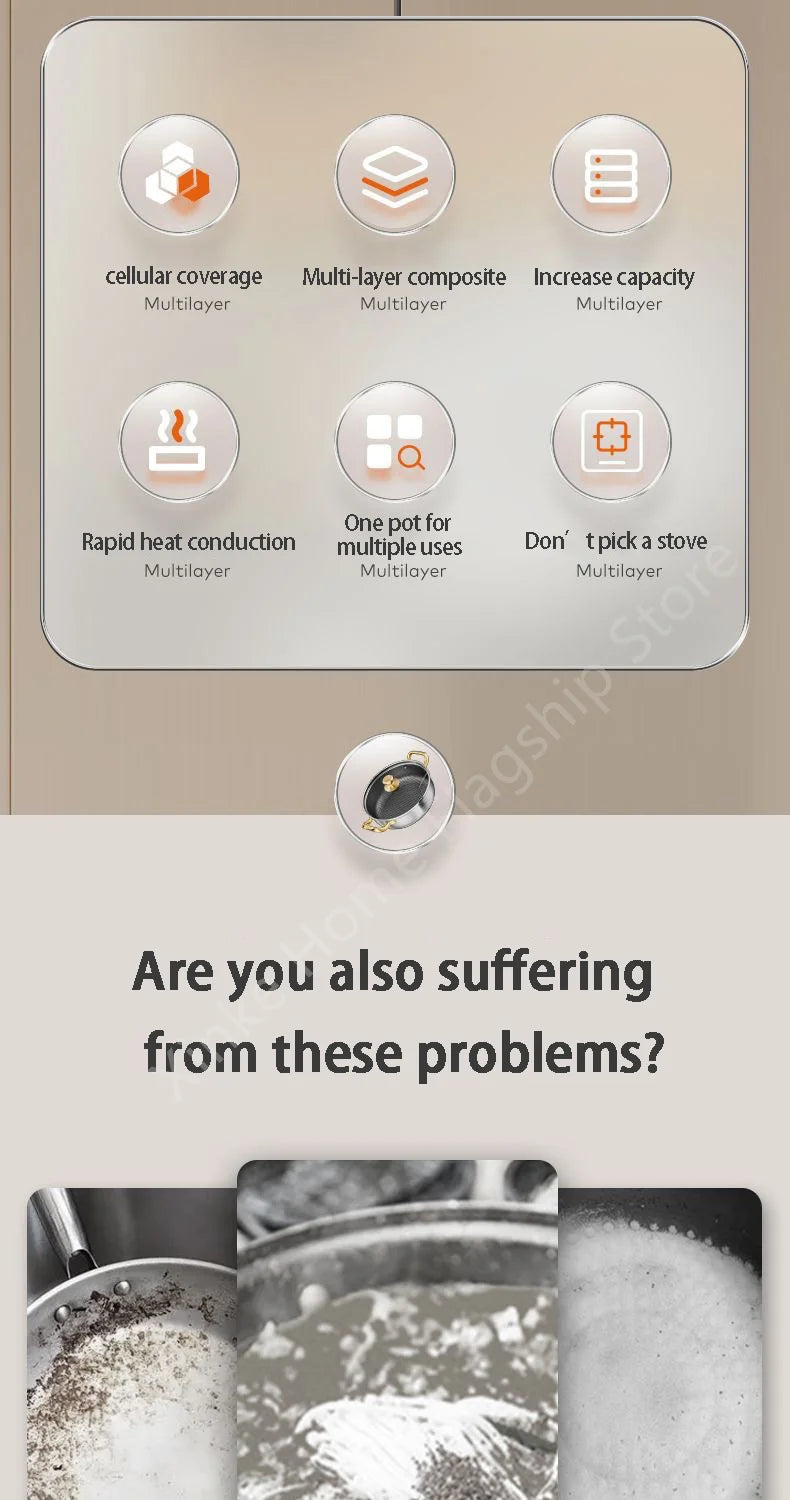3. Steel, aluminum and steel three-layer through-body pressing process, inner layer of pure aluminum material, fast heat transfer, uniform heating, less oil smoke.