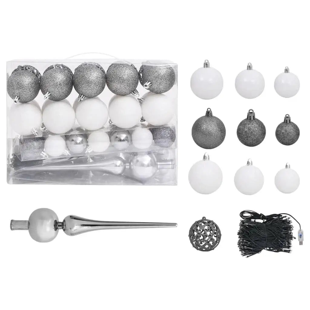 - Delivery Contains: 1 x Christmas tree, 1 x Stand, 1 x LED string light, 1 x Peak, 20 x 3 cm ball, 21 x 4 cm ball, 20 x 6 cm ball